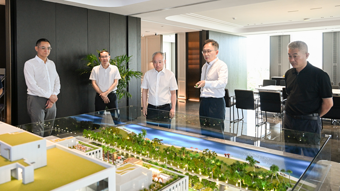 6月11日下午,海口市委副書記、市長丁暉及常務副市長鄧立松帶隊蒞臨海南鴻寶投資總部項目調研指導,江東新區管理局黨委書記王明夫、局長張笑寒陪同參觀。